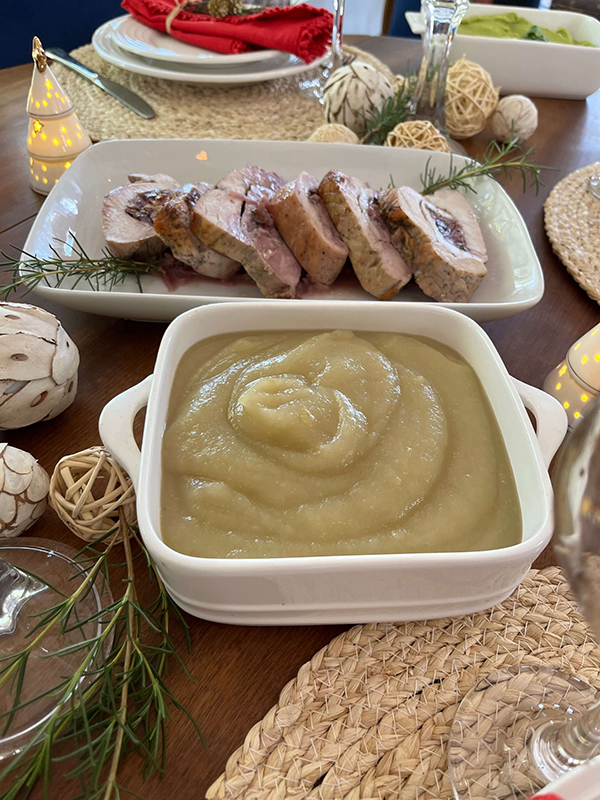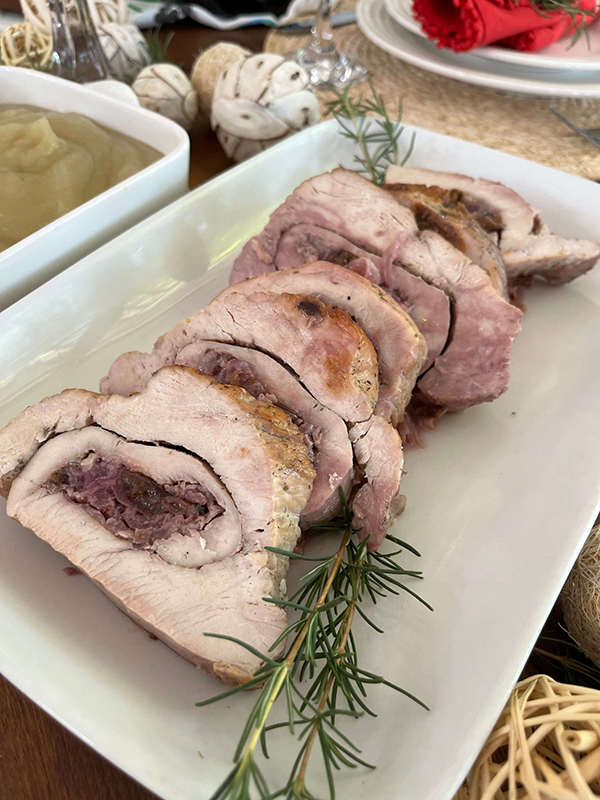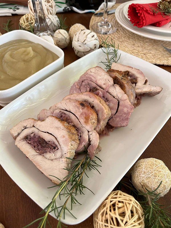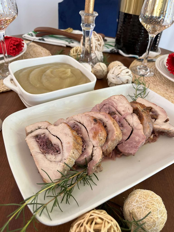 ¡Elegancia y sabor! Pechuga de pavo rellena con cebolla caramelizada y nueces, cortada en medallones y acompañada de una cremosa salsa de cebolla y dijon. (1 bandeja de 6 a 8 medallones)