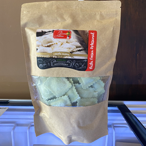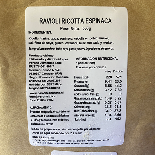 Pasta tradicional italiana, cruda congelada, elaborada con relleno de espinaca y ricotta. Es una de las mejores recetas para cuidar nuestro cuerpo y comer verdura. Se trata de una forma fácil, rápida y exquisita de aportar un tipo de nutrientes muy beneficiosos para nuestra salud. Esta pasta combina perfecto con salsa de callampas.